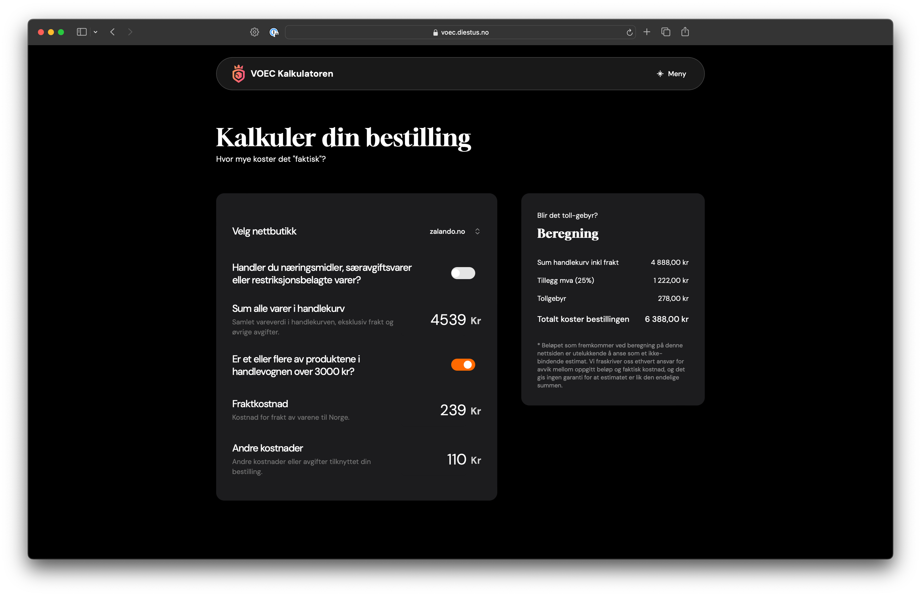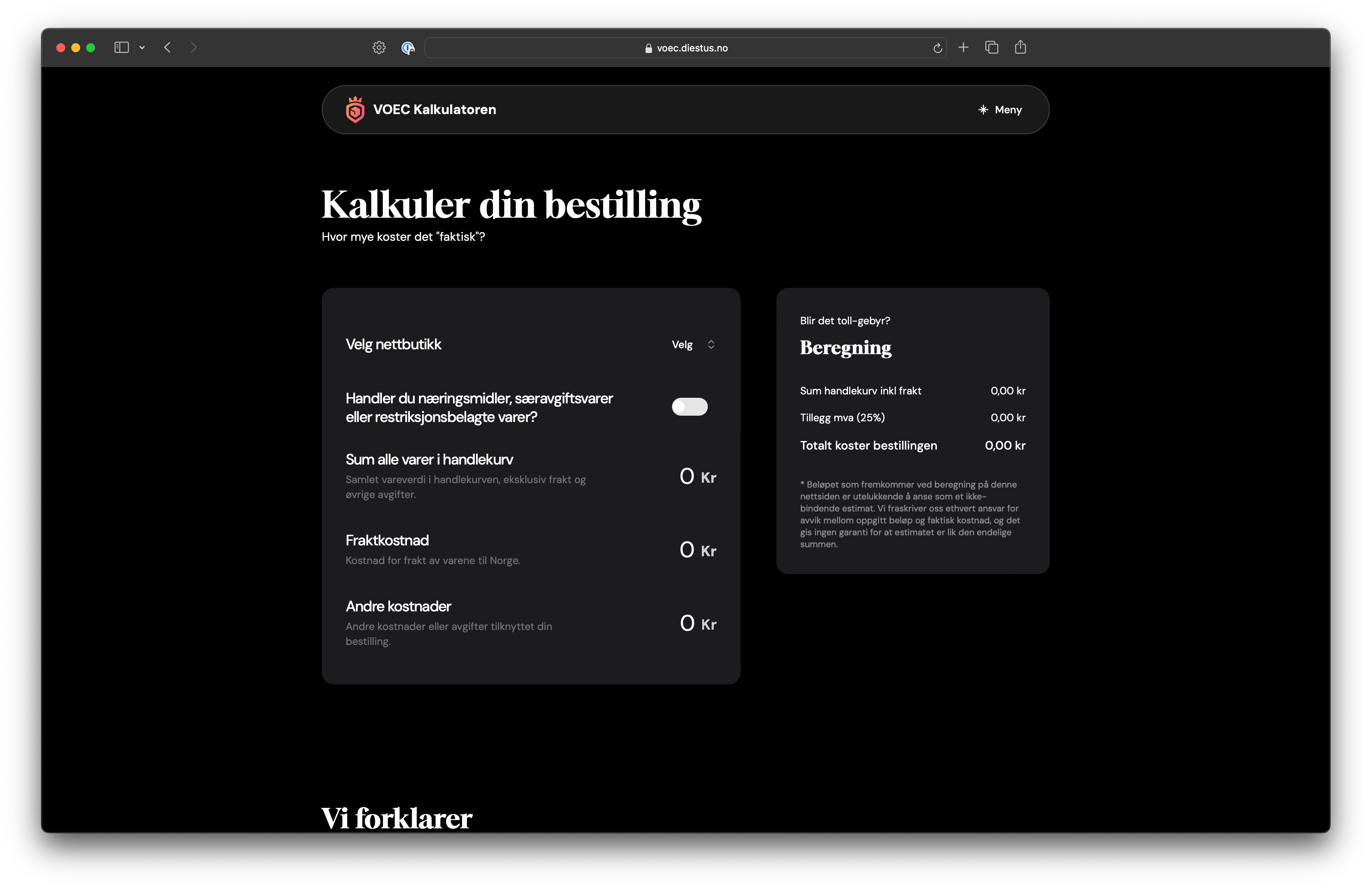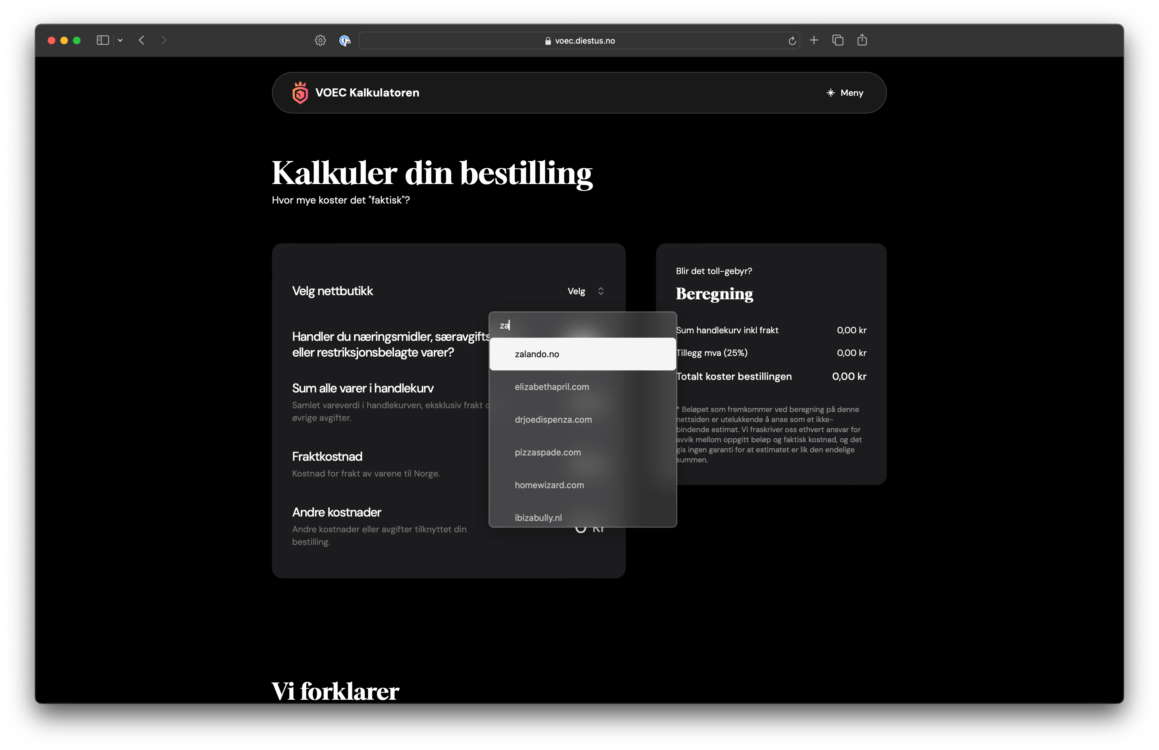 A public tool that helps online shoppers in Norway understand if the store they're ordering from is part of the VOEC (VAT On E-Commerce) scheme, and what the total price will be after taxes and customs duties.