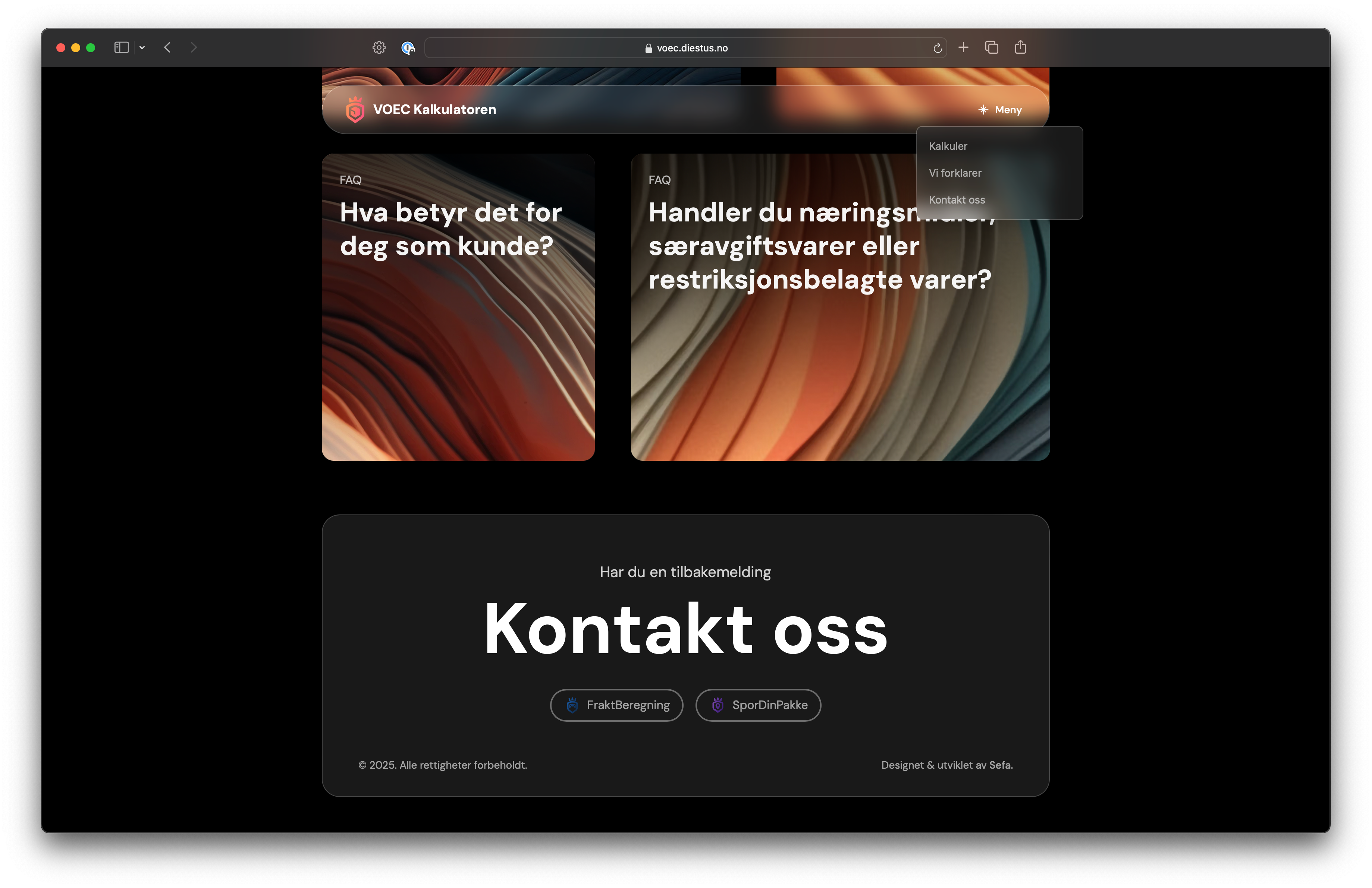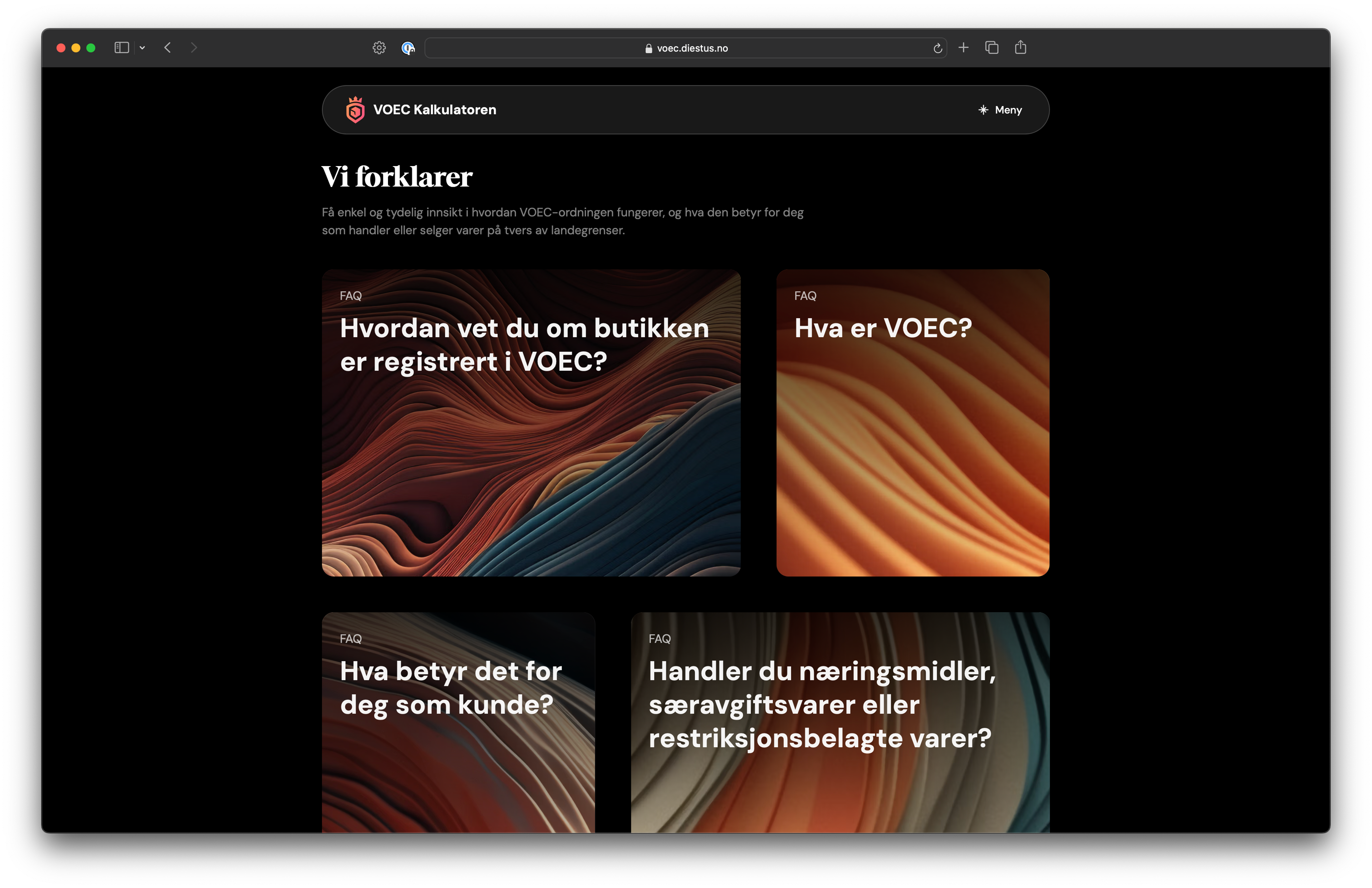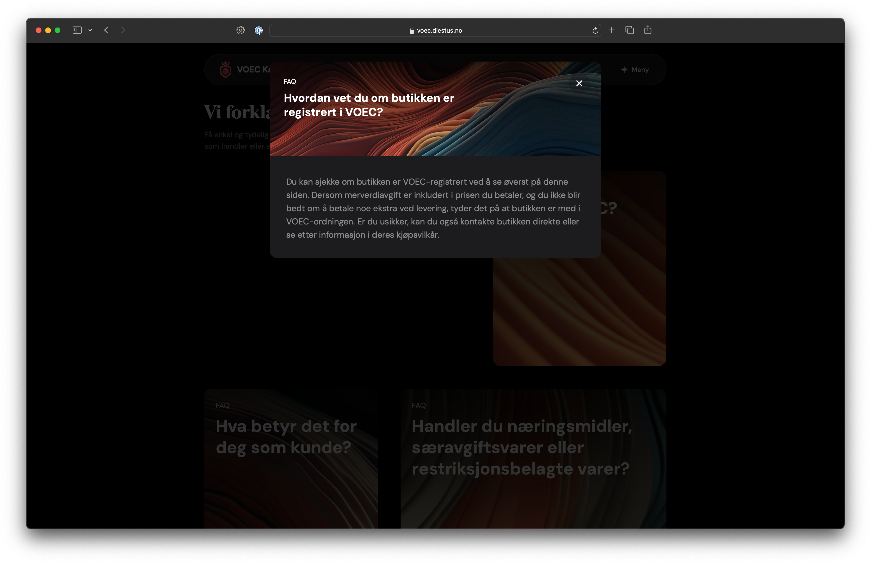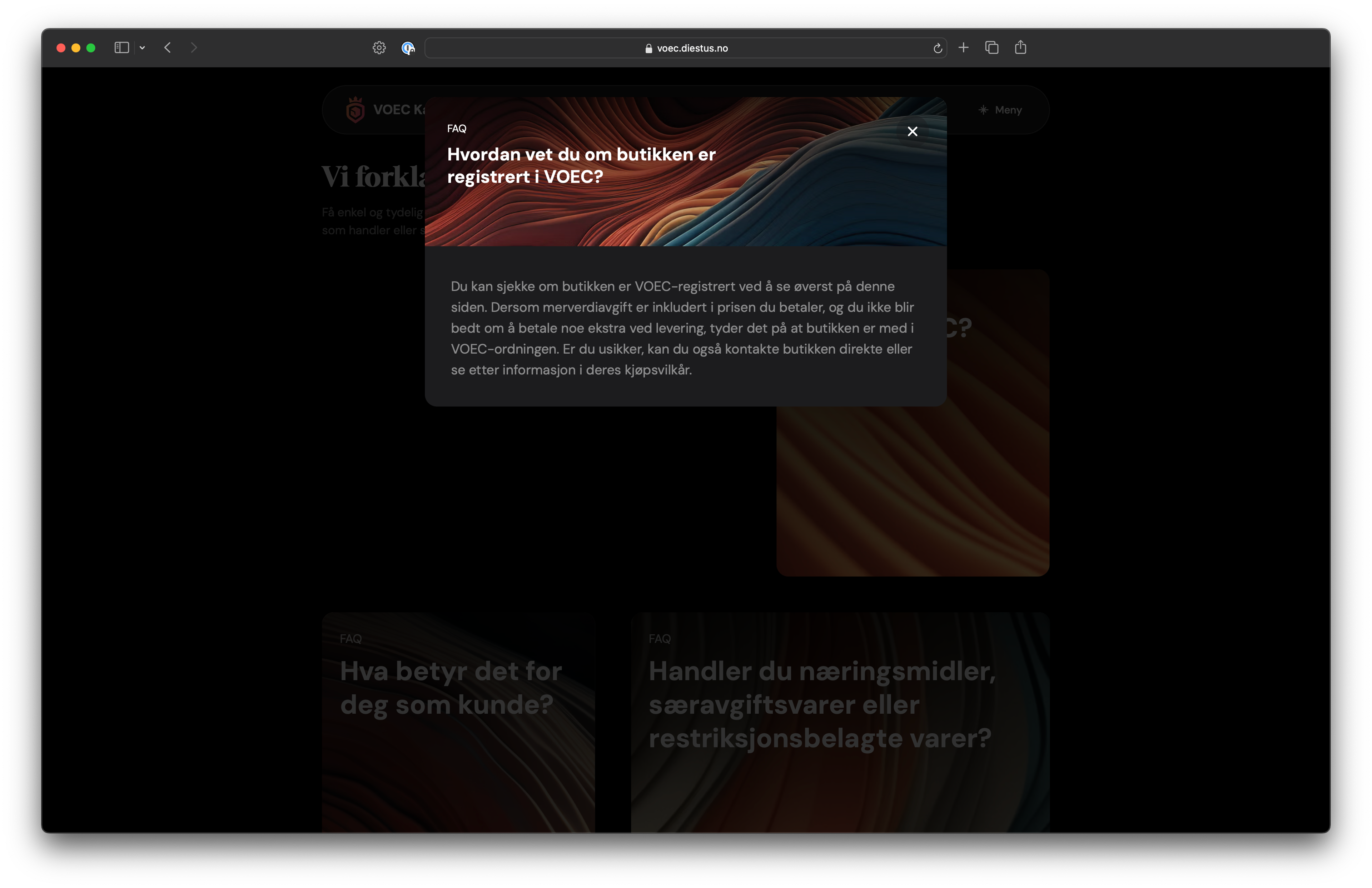 A public tool that helps online shoppers in Norway understand if the store they're ordering from is part of the VOEC (VAT On E-Commerce) scheme, and what the total price will be after taxes and customs duties.